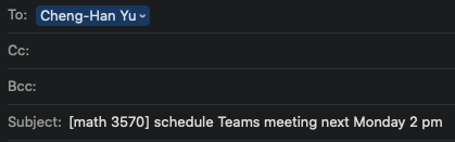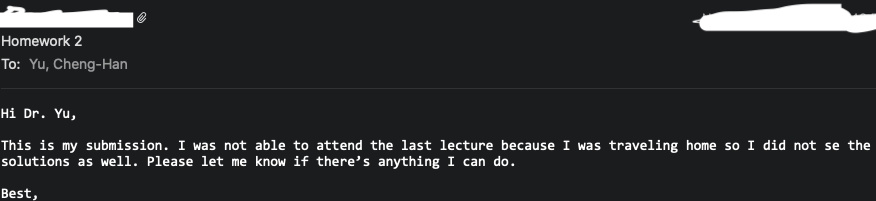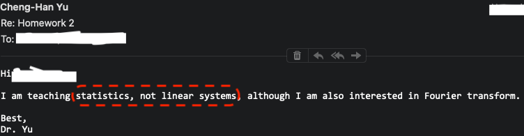 ::: - This is a real case happened last semester. A student of my class sent her homework of another class linear systems to me because the instructor of that course also has last name Yu, and she messed up. So if you remember to add course number in the subject line, it will greatly reduce the possibility of sending a wrong message. And it will save your time and my time, and so we all can work more efficiently. Right? :::