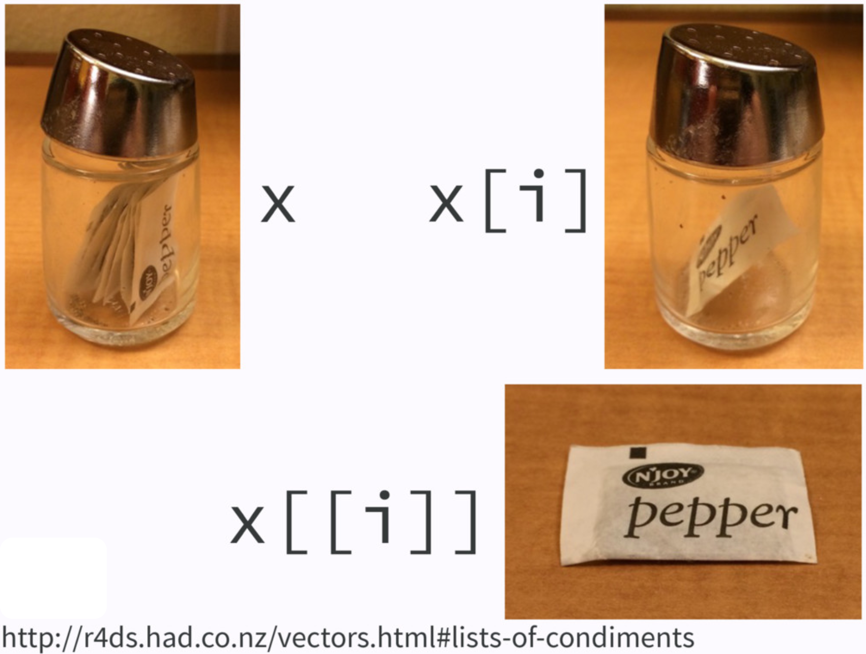 xis a train carrying objects, thenx[[5]]is the object in car 5;x[4:6]is a train of cars 4-6.— @RLangTip, https://twitter.com/RLangTip/status/268375867468681216
