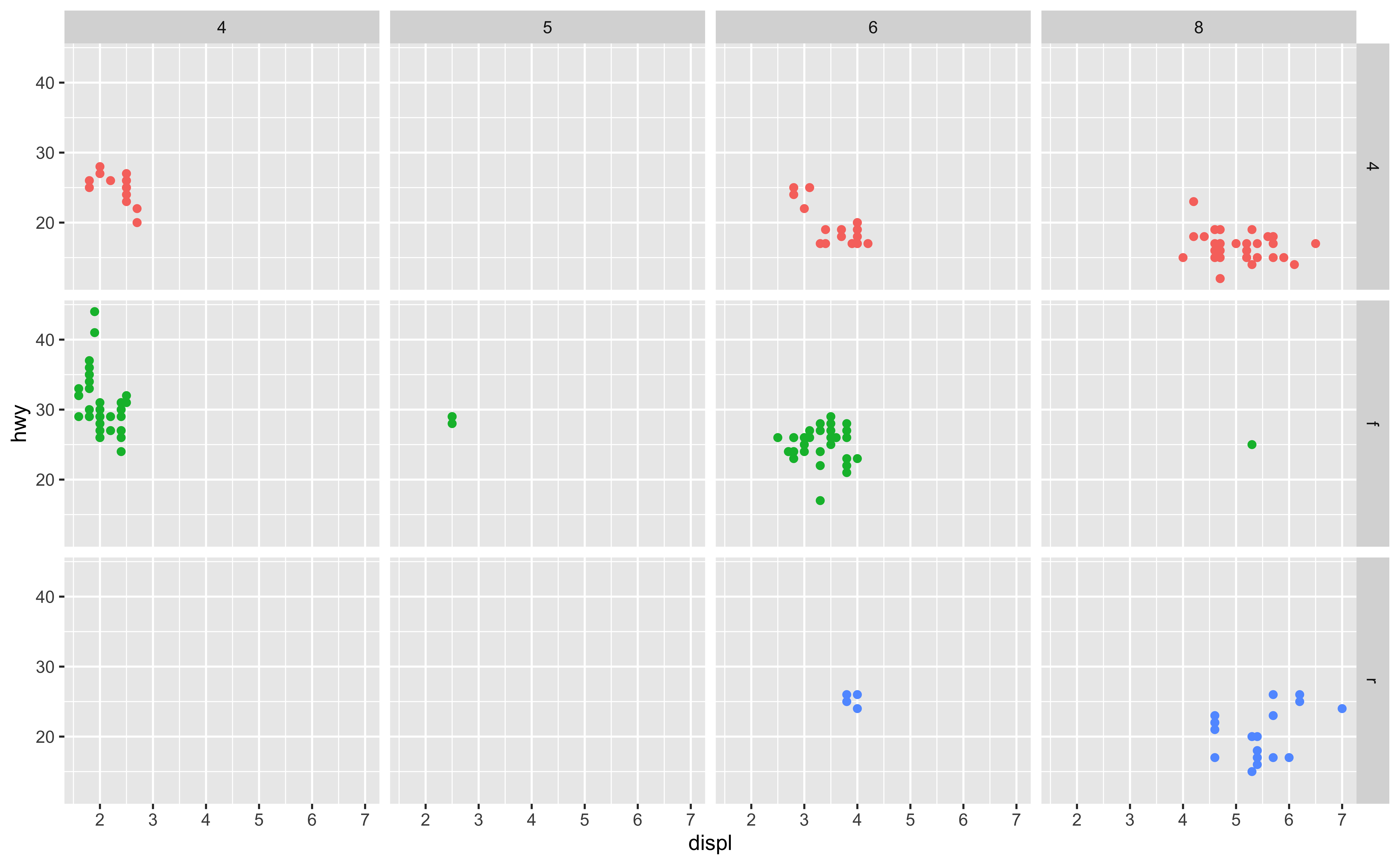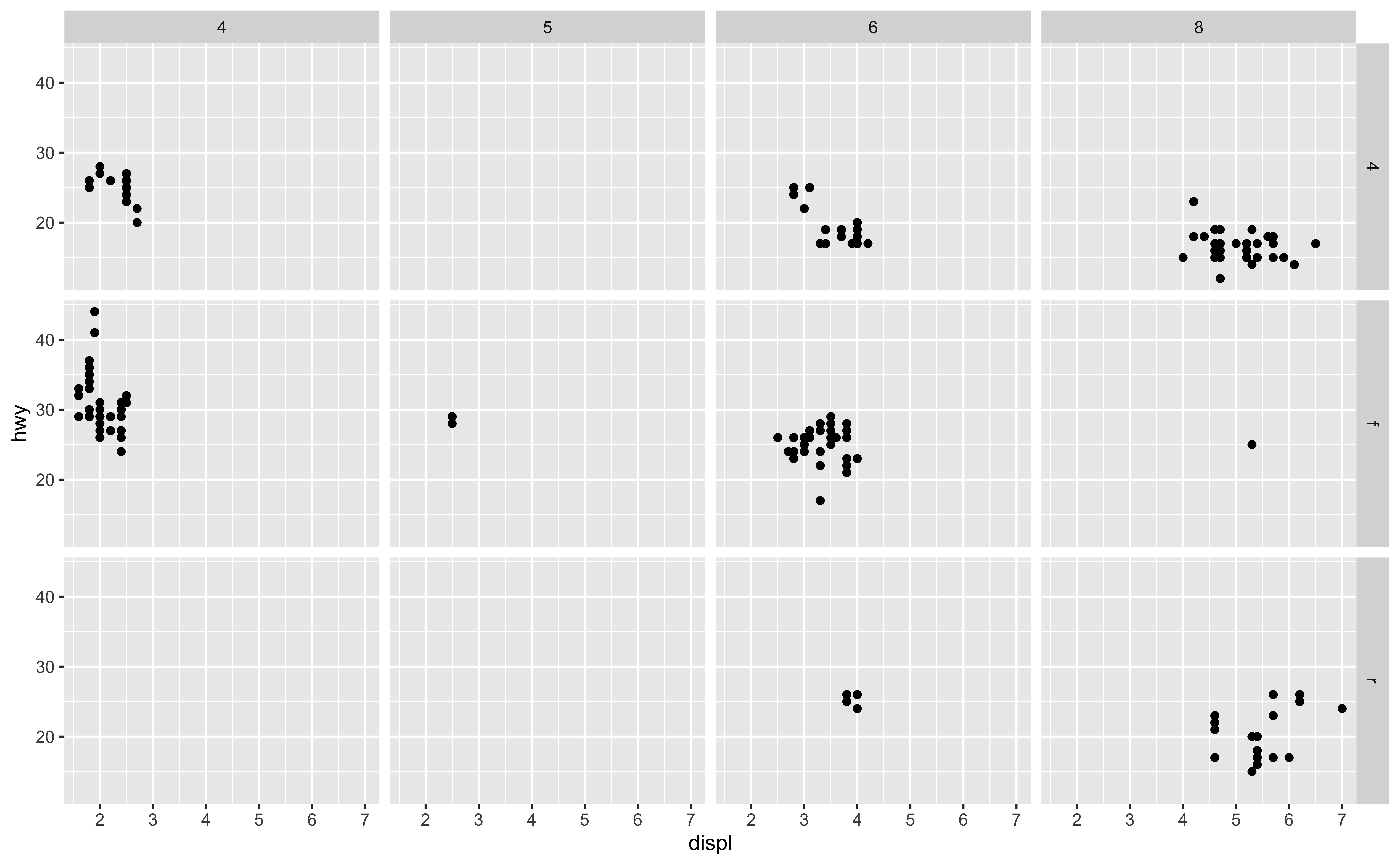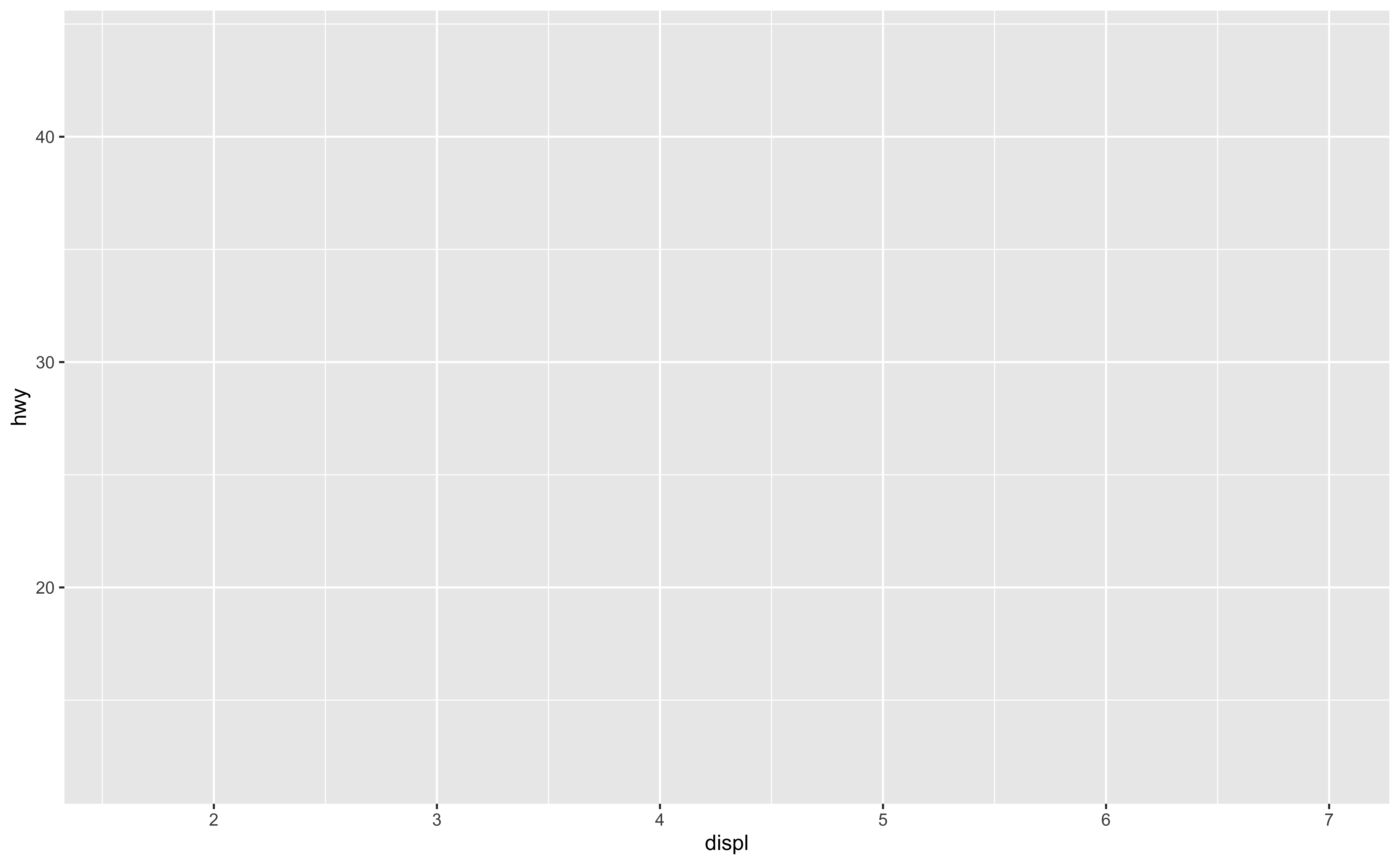 mpgdata frame, map engine displacement to the x-axis and map highway miles per gallon to the y-axis. Represent each observation with a point