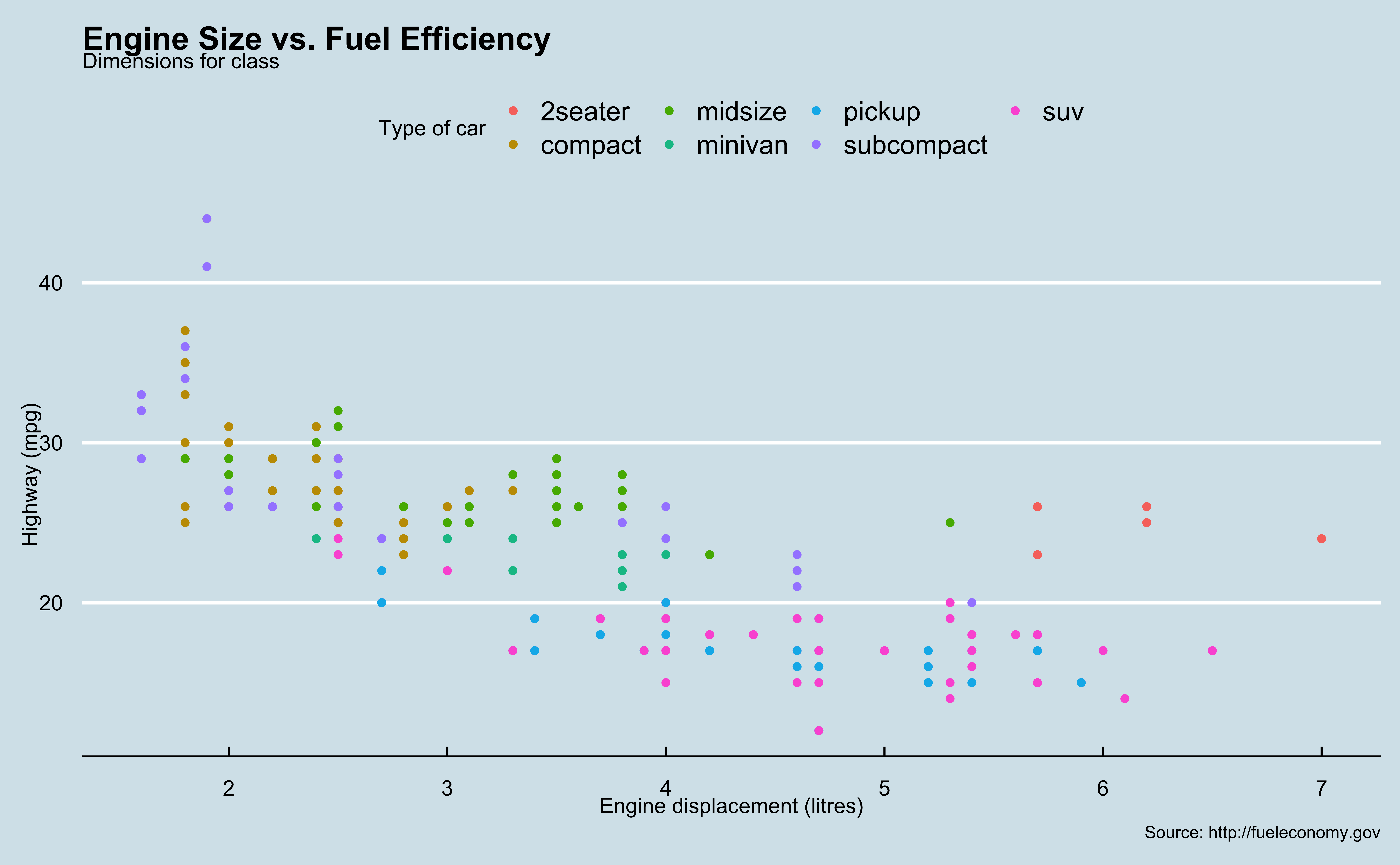 mpgdata frame, map engine displacement to the x-axis and map highway miles per gallon to the y-axis. Represent each observation with a point and map type of car (class) to the color of each point. Title the plot “Engine Size vs. Fuel Efficiency”, add the subtitle “Dimensions for class”, label the x and y axes as “Engine displacement (litres)” and “Highway (mpg)”, respectively, label the legend “Type of car”, and add a caption for the data source. Finally, use a discrete color scale that is designed to be perceived by viewers with common forms of color blindness.