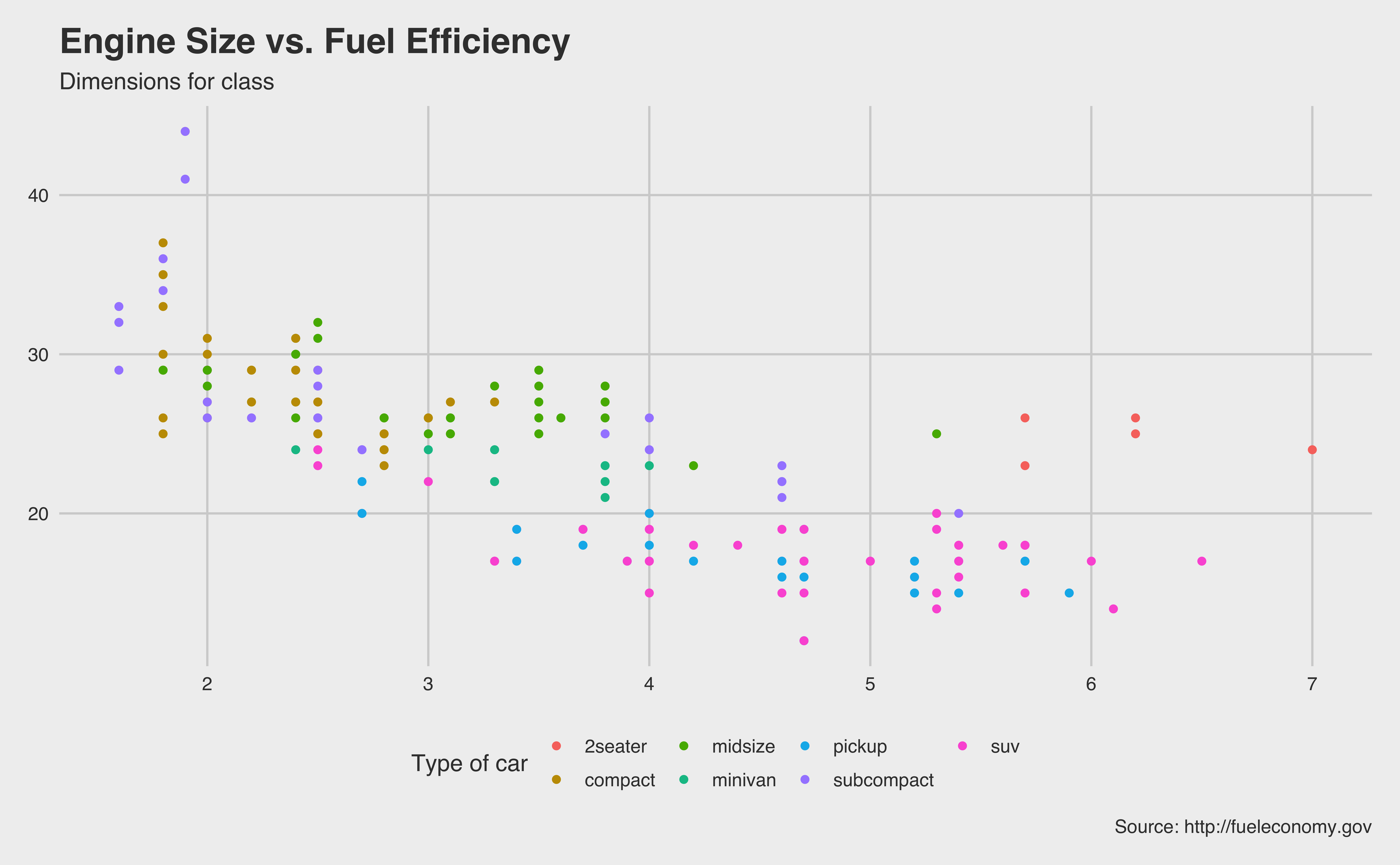 mpgdata frame, map engine displacement to the x-axis and map highway miles per gallon to the y-axis. Represent each observation with a point and map type of car (class) to the color of each point. Title the plot “Engine Size vs. Fuel Efficiency”, add the subtitle “Dimensions for class”