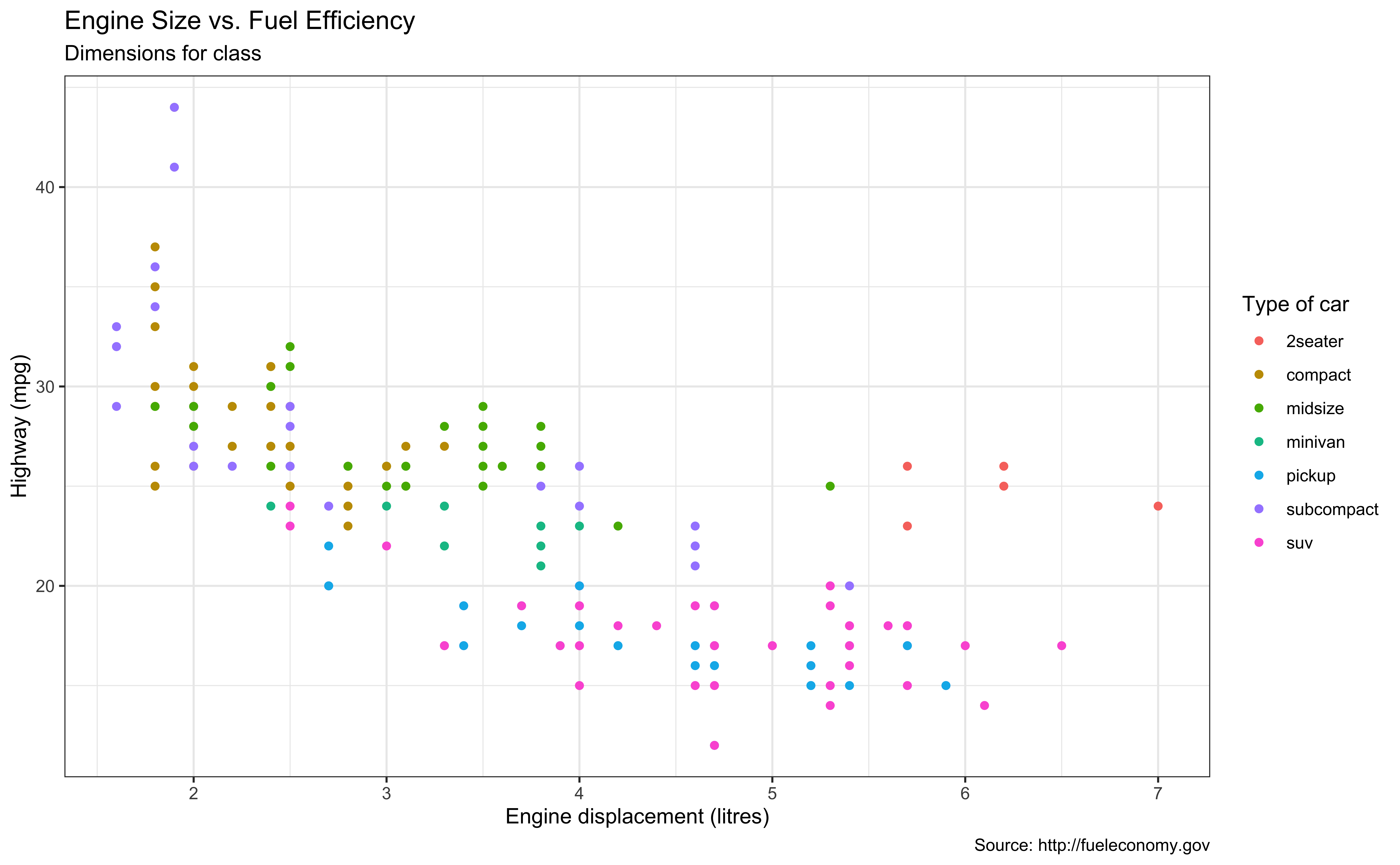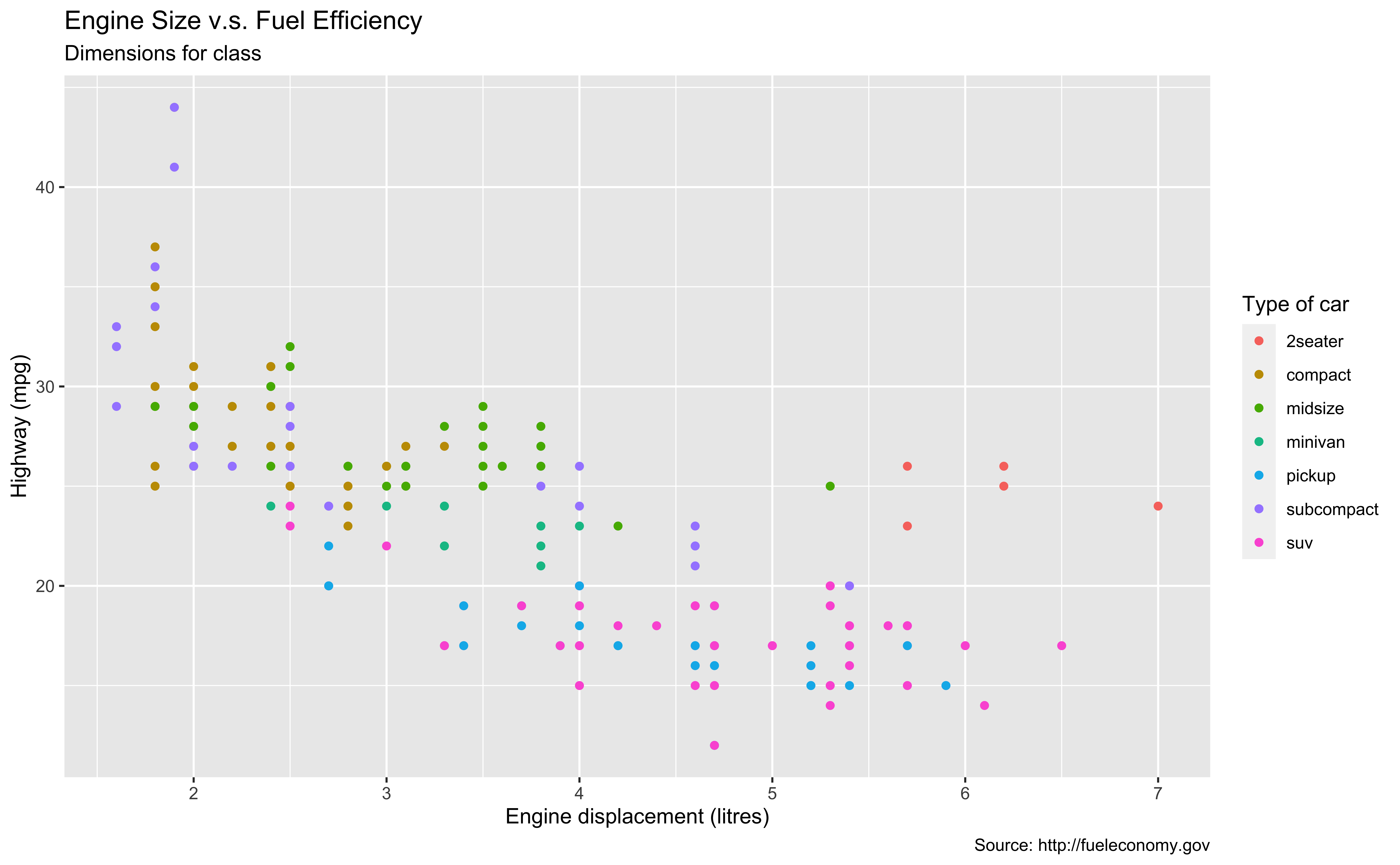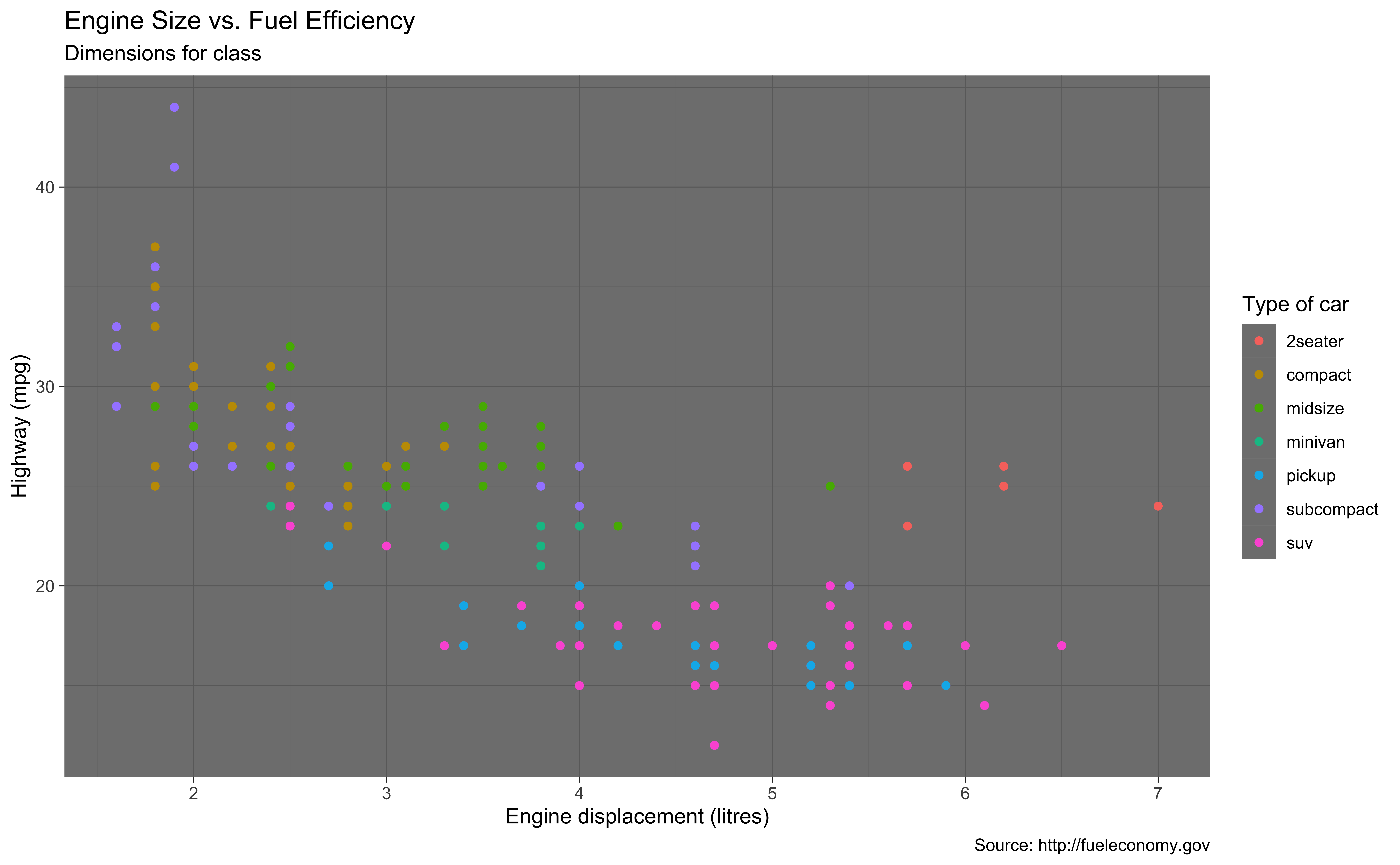 mpgdata frame, map engine displacement to the x-axis and map highway miles per gallon to the y-axis. Represent each observation with a point and map type of car (class) to the color of each point. Title the plot “Engine Size vs. Fuel Efficiency”, add the subtitle “Dimensions for class”, label the x and y axes as “Engine displacement (litres)” and “Highway (mpg)”, respectively, label the legend “Type of car”, and add a caption for the data source.