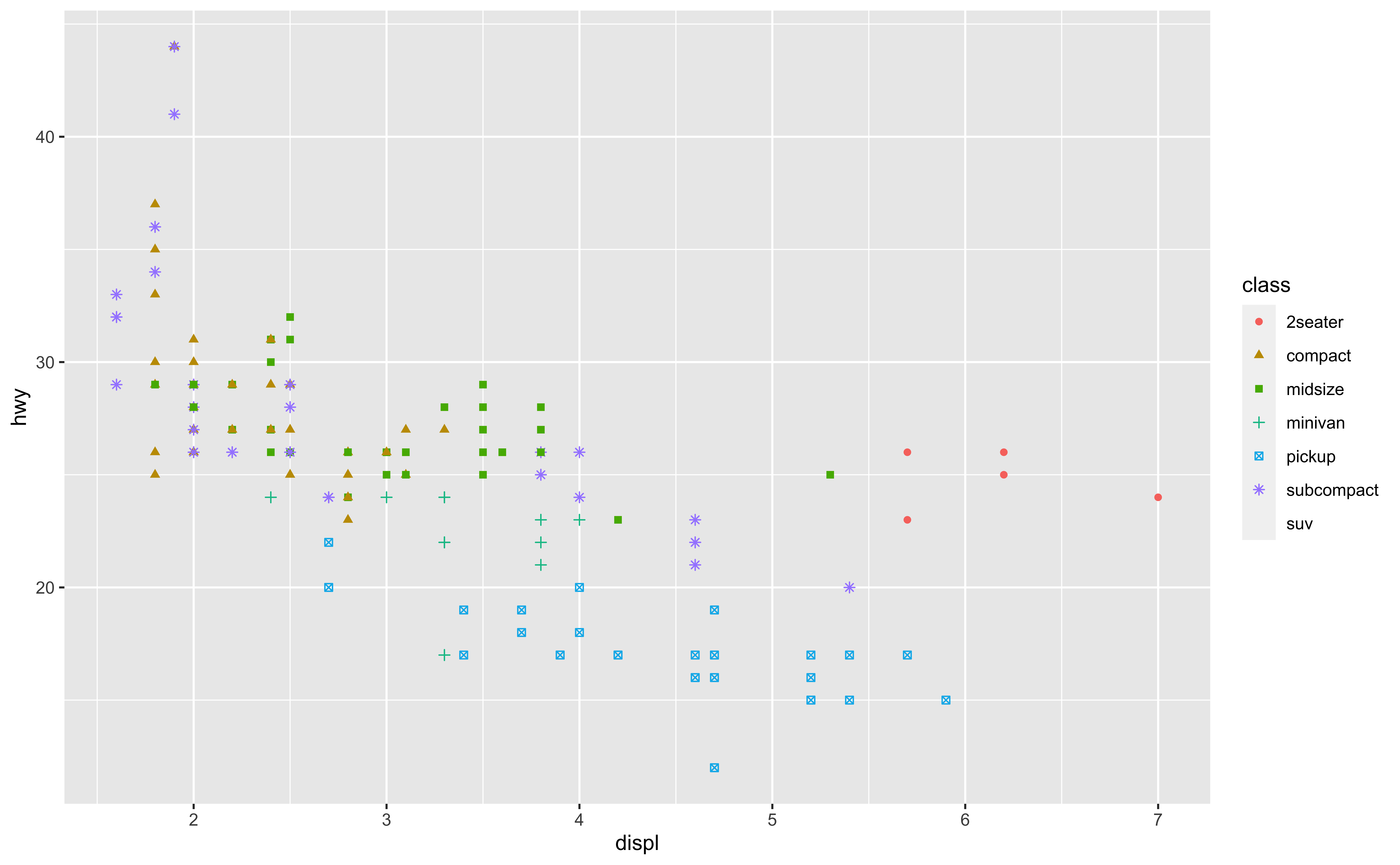 mpgdata frame, map engine displacement to the x-axis and map highway miles per gallon to the y-axis. Represent each observation with a point and map type of car (class) to the color of each point.
