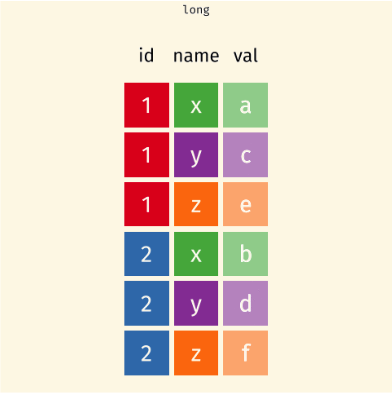 data: data framenames_from: which column variable in the long format contains the what should be column names in the wide formatvalues_from: which column variable in the long format contains the what should be (cell) values in the new columns in the wide format# A tibble: 6 × 3