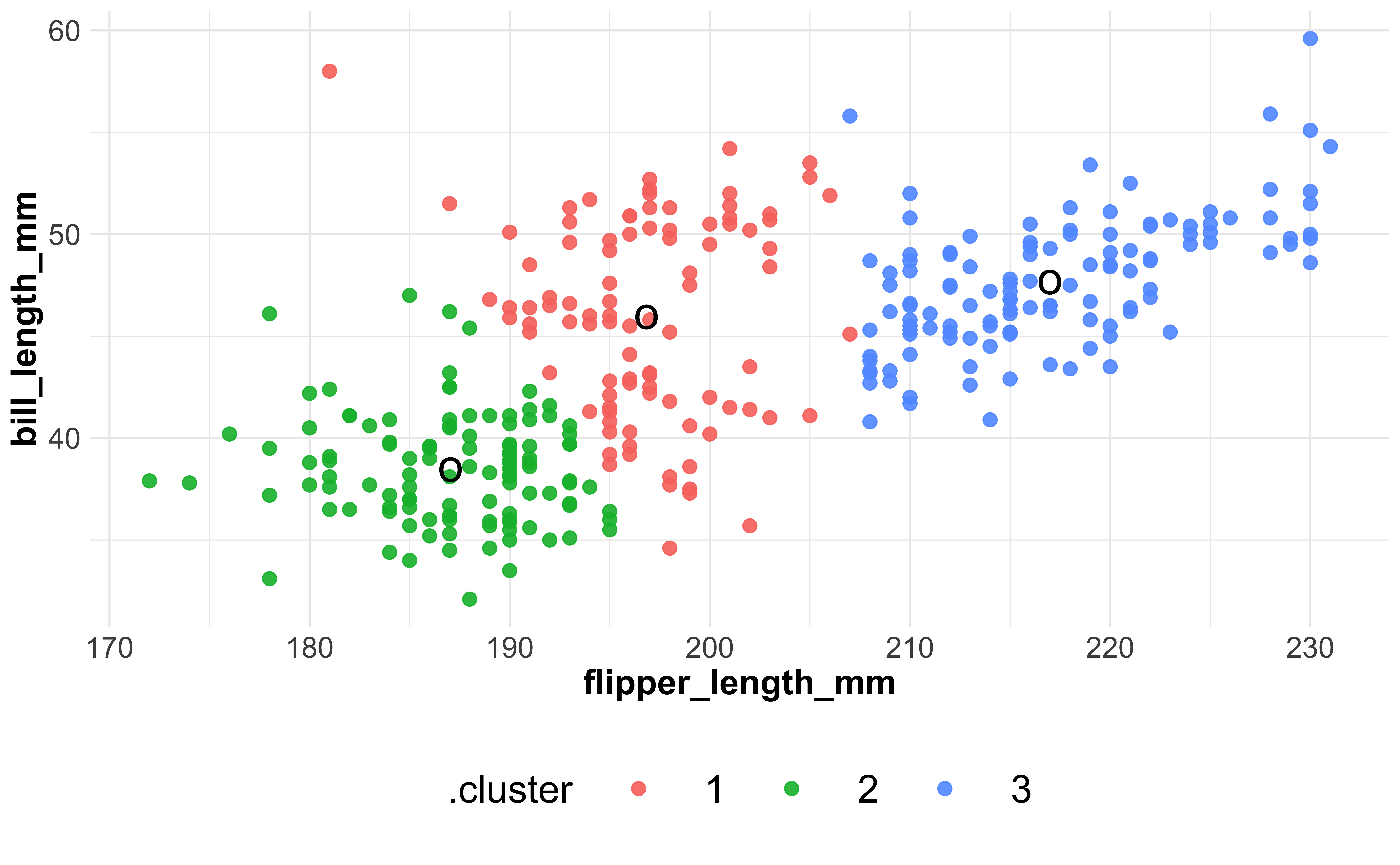 Perform K-Means to with \(K = 3\) to cluster penguins based on bill_length_mm and flipper_length_mm of data peng.